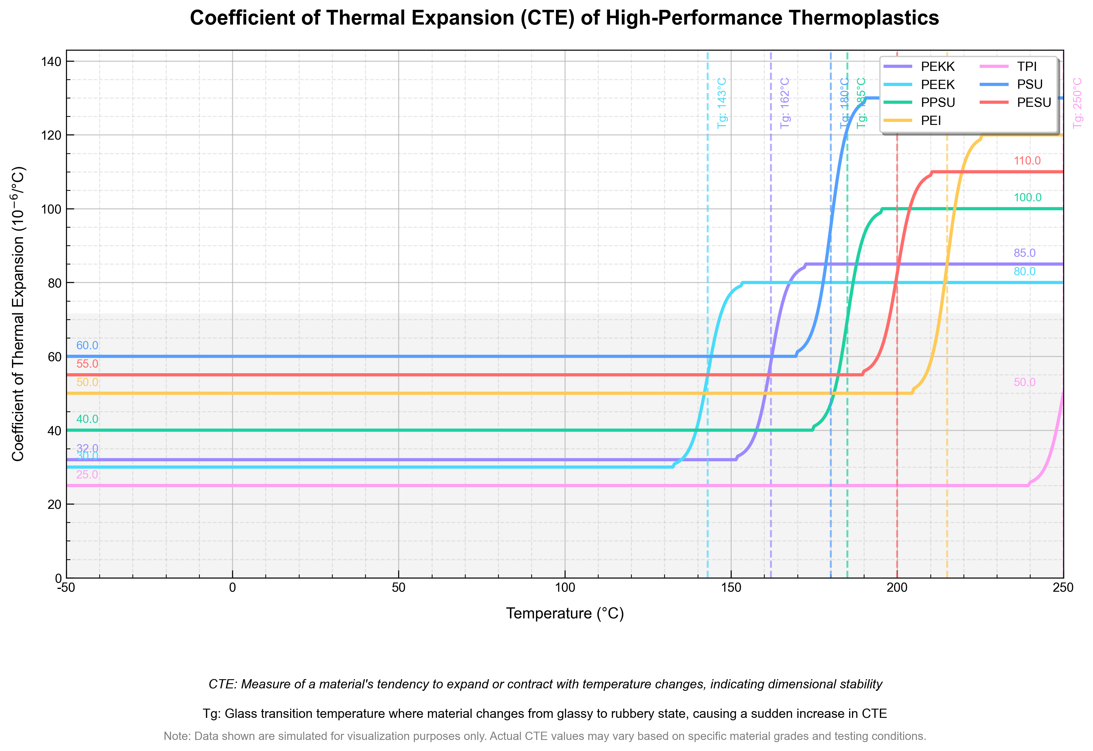 - Above Tg (Rubbery State): As temperature exceeds Tg, molecular chain mobility increases dramatically, leading to a sharp rise in CTE. For PEEK, this transition is striking: above 143℃, its CTE jumps to roughly 80×10⁻⁶/℃—more than double its glassy-state value. This rapid expansion reflects reduced dimensional stability, a factor that must be accounted for when designing components intended to operate above a material’s Tg.