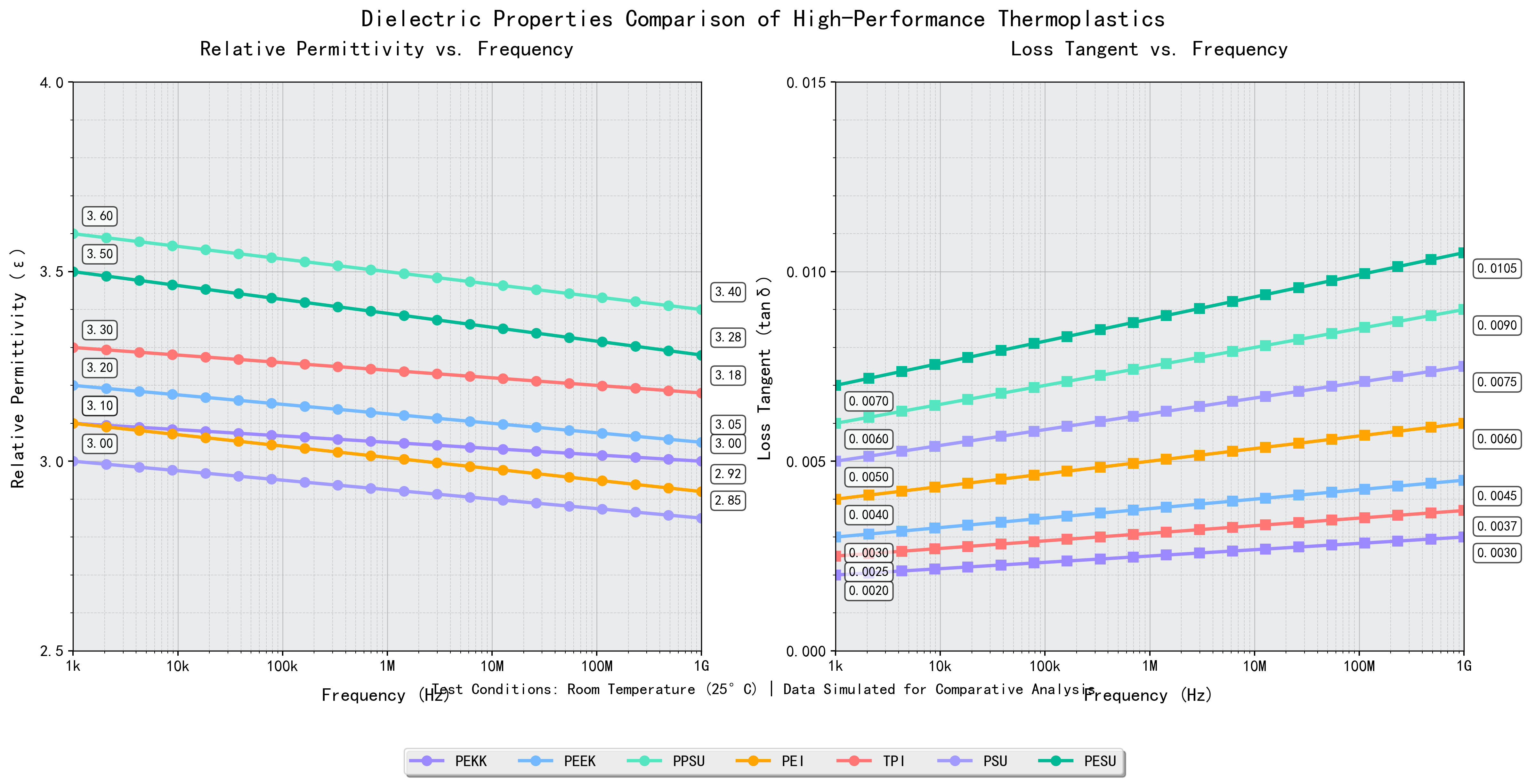 PEEK (ε=2.8–3.0) and TPI (ε=2.9–3.1) also show excellent dielectric stability, suitable for low-loss insulation in power electronics. PPSU (ε=3.2–3.4) has slightly higher capacitance, making it better for capacitor applications. PSU and PESU have the highest ε values (3.5–3.7) and are limited to low-frequency insulation (e.g., household electrical wiring).