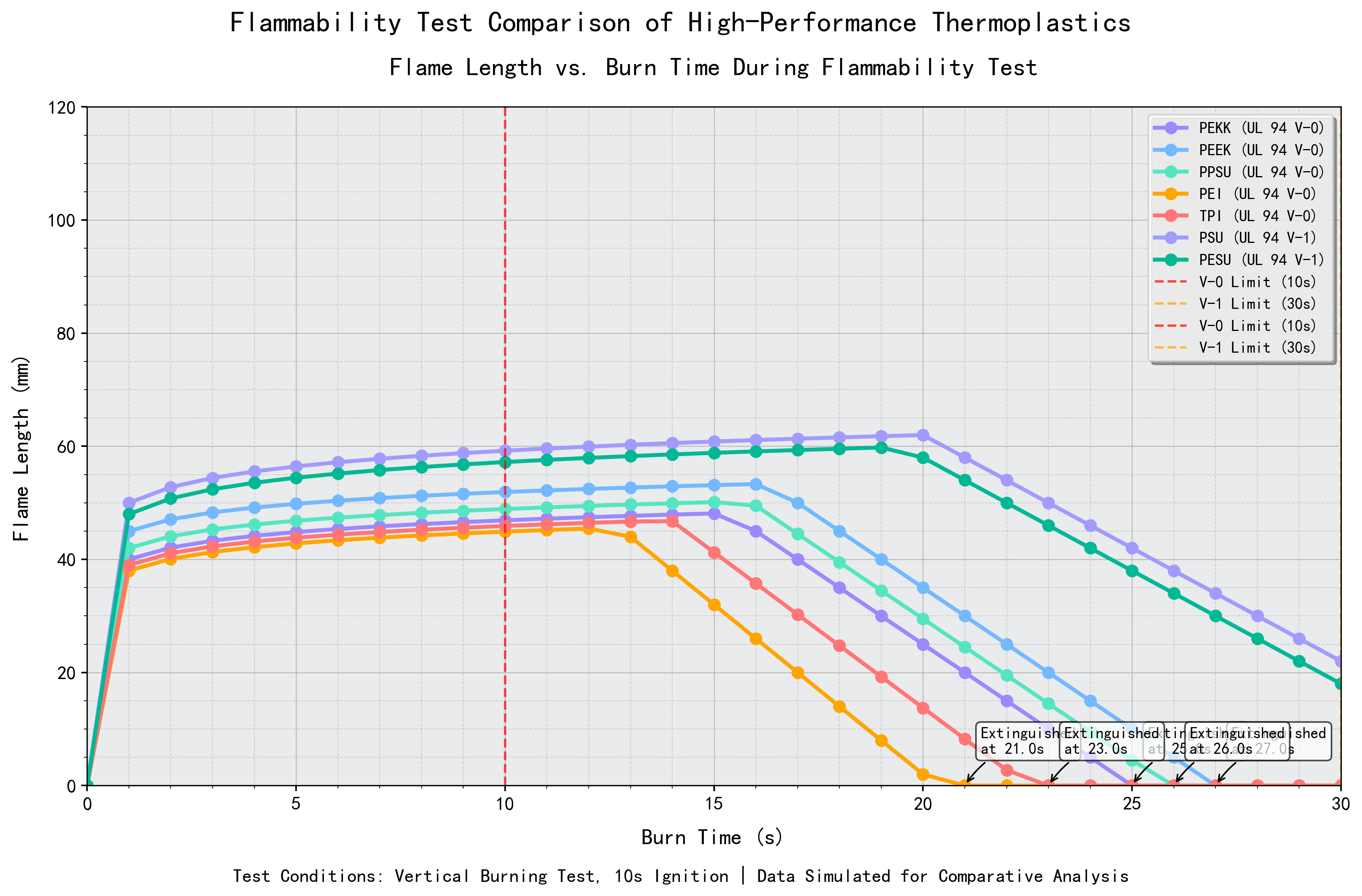 PEEK and PEKK also meet V-0 standards but require thicker samples (>1.5 mm) to avoid dripping. PPSU has a V-1 rating (flames extinguish within 30 seconds), making it acceptable for industrial equipment but not for strict aerospace safety requirements. PSU and PESU have V-2 ratings (dripping allowed), limiting their use to non-critical applications.