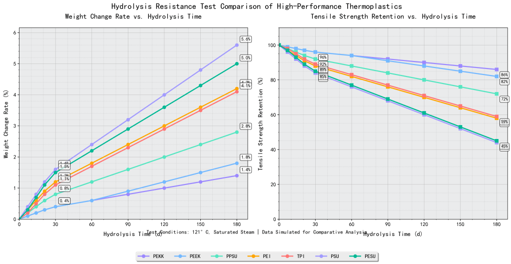 PEKK shows slightly higher weight gain (~1.5%) but maintains 98% of its mechanical strength, making it a viable alternative for less frequent sterilization. PPSU has acceptable hydrolytic stability (~2–3% weight change) but may require design modifications to prevent long-term water absorption. PSU and PESU show the highest weight change (~4–5%) and are not recommended for repeated autoclaving.