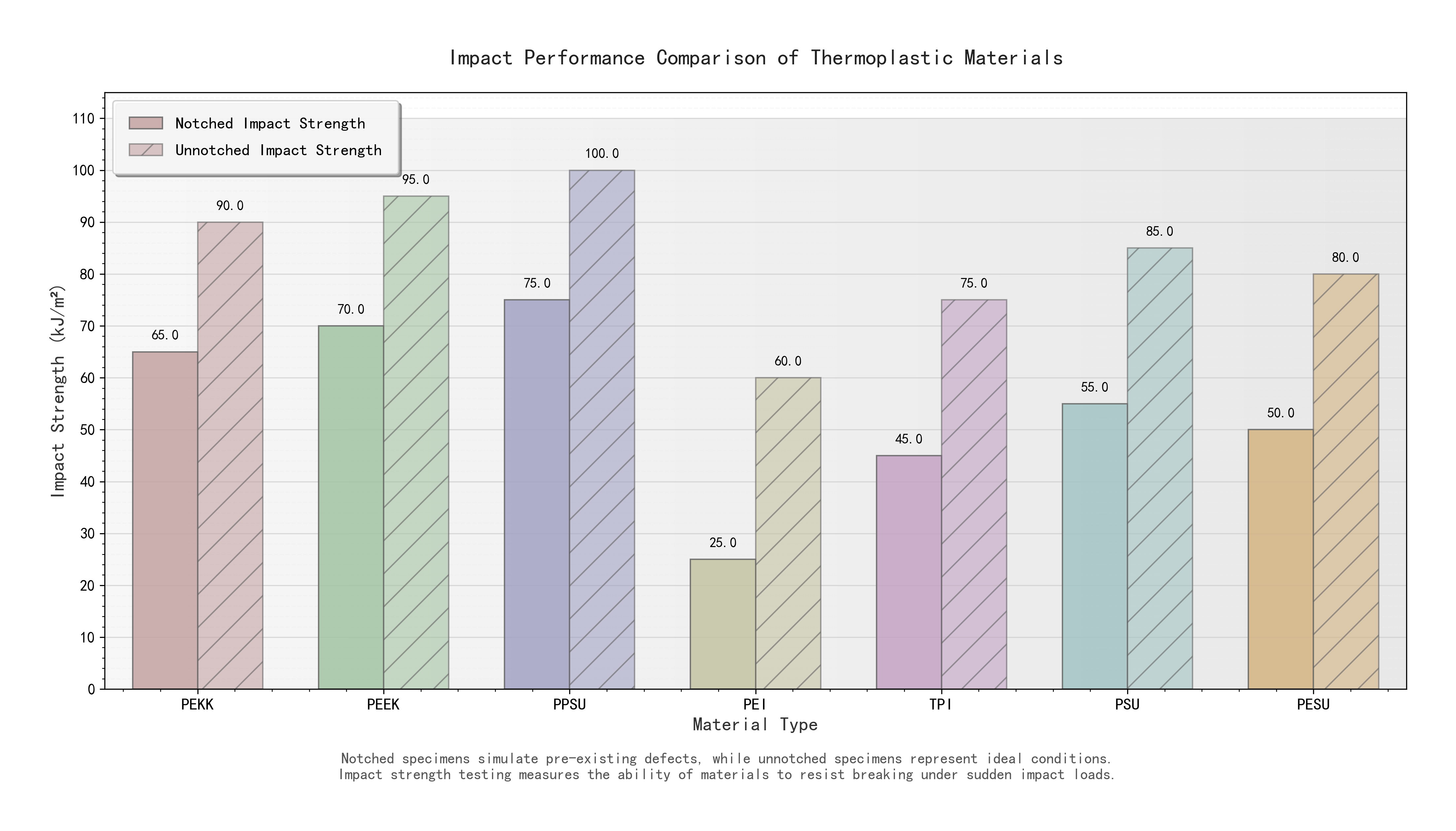 PEEK and PEKK exhibit solid unnotched impact strength (50–60 kJ/m²), but their notched performance drops by ~30%, indicating sensitivity to surface defects. This means they require careful machining to avoid stress concentrations in high-impact applications. PEI and TPI show the lowest impact resistance (20–30 kJ/m² for notched samples), making them better suited for static or low-vibration environments, such as laboratory equipment frames.