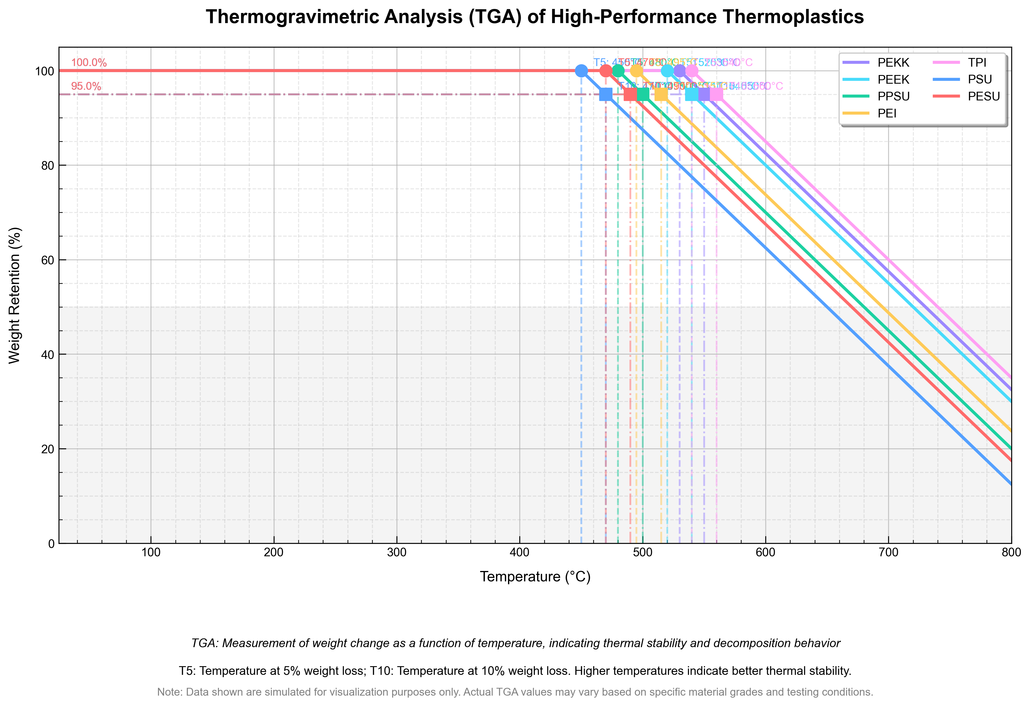PEKK follows closely (T5 ~500°C, T10 ~520°C) and is preferred for applications where processing ease (e.g., 3D printing) is as important as thermal stability. PEI (T5 ~490°C) and TPI (T5 ~480°C) show slightly earlier degradation but still outperform standard engineering plastics. PPSU (T5 ~480°C), PSU (~460°C), and PESU (~470°C) are sufficient for most industrial applications but are not recommended for temperatures above 400°C.