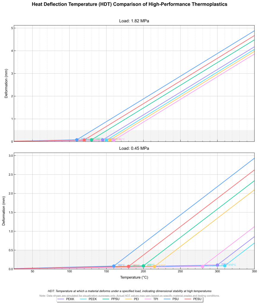 HDT measures the temperature at which a material deforms under a constant load, indicating its ability to maintain shape in high-heat conditions. Under low load (0.45 MPa), PEEK and TPI excel with HDT values of ~310°C and ~290°C, respectively—making them suitable for aerospace components like engine cowling parts or satellite thermal management systems.