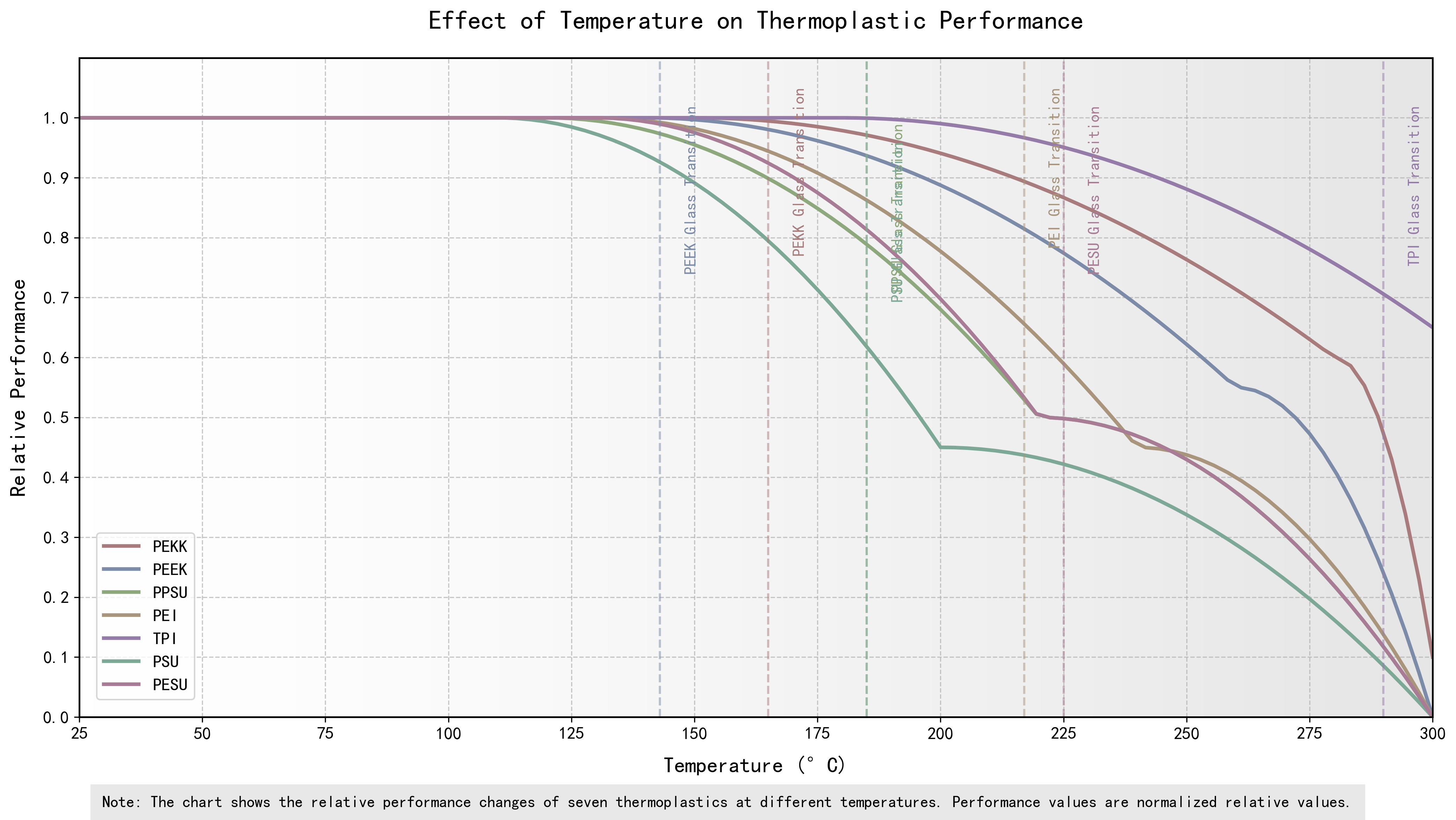 High-performance plastics are often used in environments with extreme or fluctuating temperatures, so thermal stability—measured by heat deflection temperature (HDT), glass transition temperature (Tg), and thermal degradation (TGA)—is a key differentiator.